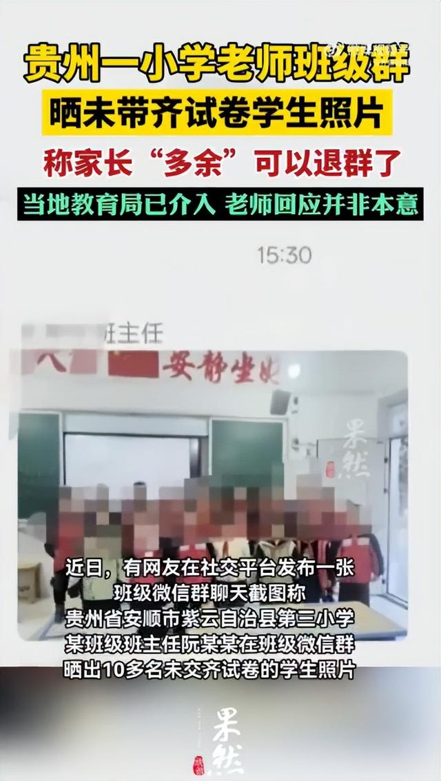 据媒体此前报道,近日,有网友在社交平台发布一张班级微信群聊天截图称,贵州省安顺市紫云自治县第三小学某班主任阮某某,在班级微信群晒出10多名未交齐试卷的学生照片。该老师称上述学生家长在群里“多余”,可以退群了,此事引发关注。
