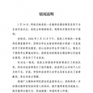 经核实,2026年1月13日下午,我校三年级的一名教师在课堂教学中,因部分学生未按老师的提示将前一天发放的学习资料带到教室,担心这部分学生学习跟不上,情急之下便将学生聚集到讲台,拍照发到班级家长微信群以引起家长重视,并发布了不当表述。