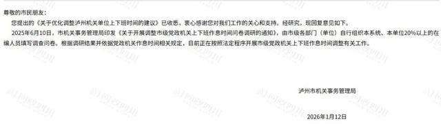 泸州多个机关单位下午6点半下班,职工建议提早一小时,回应:已调研,正按程序调整