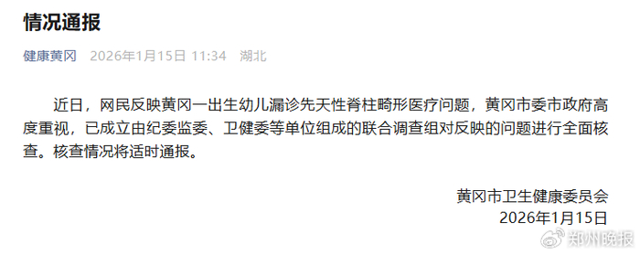 近日,湖北黄冈一宝妈称产检未见异常,孩子出生后却查出畸形。黄冈市卫健委15日发布情况通报:市委市政府高度重视,已成立联合调查组进行全面核查。