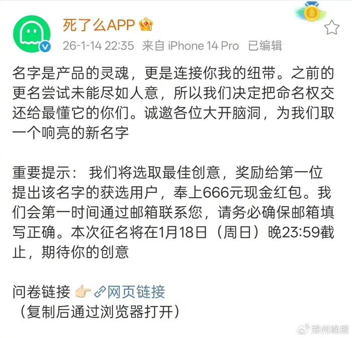 1月14日晚,死了么APP发文:名字是产品的灵魂,更是连接你我的纽带。之前的更名尝试未能尽如人意,所以我们决定把命名权交还给最懂它的你们。诚邀各位大开脑洞,为我们取一个响亮的新名字。