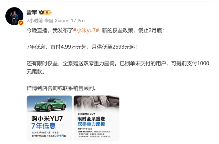 除新车信息外,雷军还在直播中宣布,小米首款纯电SUV小米YU7正式推出7年低息购车政策。该政策适用于2026年2月28日(含)前下定的用户,首付4.99万元起,月供可低至2593元,活动期间全系赠送双零重力座椅。这一举措距特斯拉推出同类金融政策仅过去一周多时间,雷军毫不避讳小米的“跟随”态度,直言“特斯拉的‘7年低息’公布后,几千条网友留言催我们跟进,团队紧急研究了一下,也推出了一个‘7年低息’的政策”。