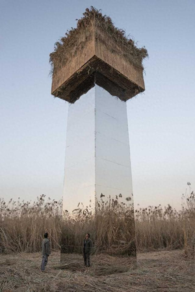 作品由9.5米高的镜面不锈钢塔将一整块芦苇湿地“抬升”到空中:芦苇不再扎根于泥土,却依然保留着自然的记忆。镜面结构映射天空、雾气与湖面,让真实与虚拟的边界变得模糊。