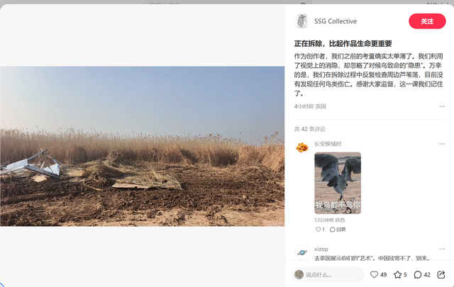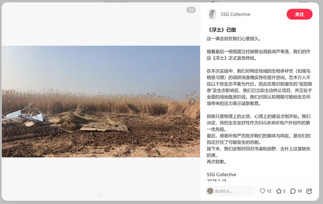 1月15日晚间,作品创作者通过社交媒体发文称:“作为创作者,我们之前的考量确实太单薄了。我们利用了视觉上的消隐,却忽略了对候鸟致命的‘隐患’。万幸的是,我们在拆除过程中反复检查周边芦苇荡,目前没有发现任何鸟类伤亡。感谢大家监督,这一课我们记住了。”