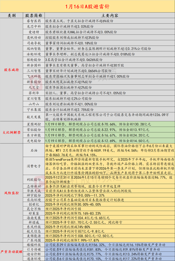 导读:财联社1月16日投资避雷针,近日,A股及海外市场潜在风险事件如下。国内经济信息方面包括:1)新机调价影响销售需求,2026年第二季度起智能手机生产承压明显;2)BBA在华销量跌回七八年前;公司方面重点关注包括:1)利欧股份2025年12月31日至2026年1月15日连续10个交易日收盘价涨幅偏离值达96.77%,股票今起停牌核查;2)20CM六连板志特新材表示业务不涉及AI应用等领域,股票今日开市起复牌;海外市场重点关注包括:1)国际油价15日显著下跌;2)LME金属期货跌多涨少,LME期锡收跌1431美元。