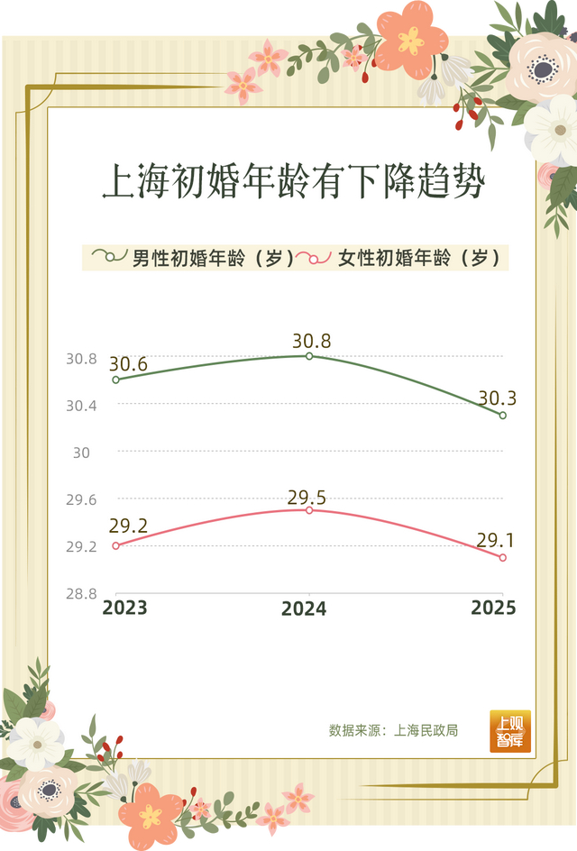 从初婚年龄数据看,2025年上海新人平均初婚年龄为29.7岁,其中男性30.3岁、女性29.1岁。这一数据对比前两年,居然下降了。