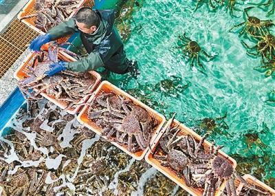 新疆吉木乃口岸优化通关服务,压缩通关时间,实现“即到即验”,让“丝路美食”加速走向餐桌。图为进口帝王蟹通过查验后准备装箱发往市场。 本报记者 李亚楠摄