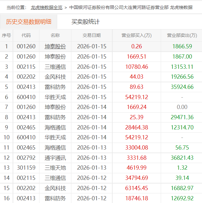 与此同时,1月15日,陈小群并没有闲着,几乎卖出所有持仓。1月14日龙虎榜显示,大连黄河路单日净买入华胜天成5.42亿元,而在1月15日的三日榜显示,大连黄河路仍只买入5.42亿元,这表明,大连黄河路在15日并没有操作华胜天成。那么表明,1月15日,大连黄河路整天都在“出货”。个股方面,当日,三维通信震荡走低,呈现出货走势;金风科技、雷科防务早盘快速核按钮跌停。