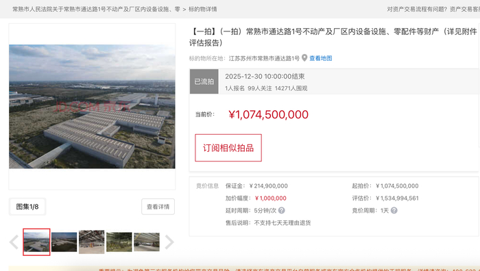 京东资产交易平台显示,常熟市通达路1号不动产及厂区内设备设施、零配件等财产一拍已于2025年12月30日10点结束,起拍价约10.75亿元,保证金约2.15亿元,也仅有1人报名。