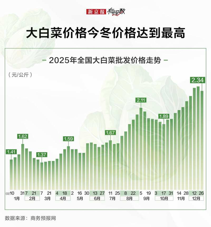 除了西红柿,冬季餐桌上的“明星蔬菜”——大白菜,今冬价格也明显上涨。据商务预报网数据,2025年12月,大白菜的批发价高达2.34元/公斤,差不多一斤一块二,和年初价格对比,涨了一倍不止。