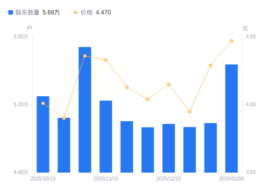 1月15日消息,数据显示,截至2026年1月9日,天桥起重A股股东总户数为5.68万户,较上期(2025年12月31日)增加6915户,增幅13.87%。公司最新A股总股本为14.17亿股,其中流通A股14.12亿股,户均持有流通A股数量为2.49万股,较上期减少3450.67股,降幅12.18%;户均持流通A股市值11.12万元,较上期减少1.03万元,降幅8.50%。