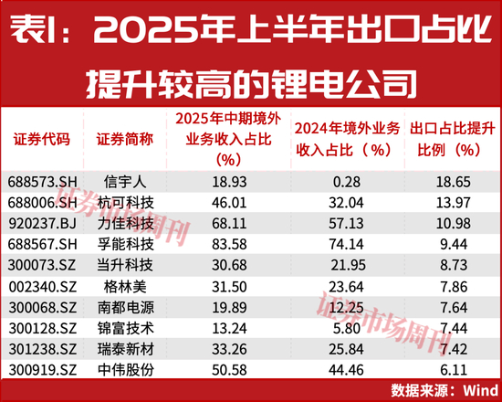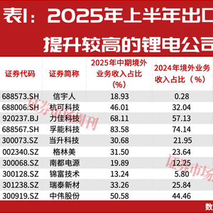 同样,在申万电池行业106只成分股中,有77家公司披露了2025年中期境外收入占比情况,其中华宝新能、浙江恒威、野马电池、孚能科技、派能科技、道氏技术、德赛电池等公司境外收入占比均在50%以上。对比2024年末数据,有45家电池公司海外收入占比实现提升,信宇人、杭可科技、力佳科技分别提升了18.65、13.97、10.98个百分点。