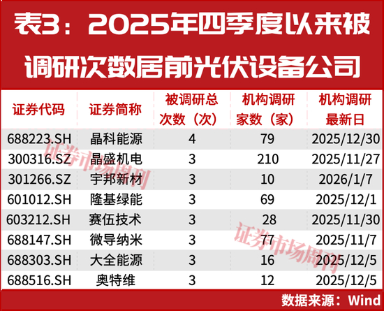 光伏设备公司中,晶科能源、宇邦新材、大全能源、奥特维等8家自2025年四季度以来被调研次数达到或超过3次。晶科能源被调研次数达到4次,在最新的一次调研中,投资人提问:“如何看待太空算力中光伏市场空间潜力和技术路线展望?”