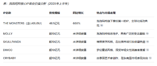 此外,MOLLY、SKULLPANDA、CRYBABY和DIMOO相关IP营收均突破10亿元;HIRONO、星星人、Zsiga、PUCKY、HACIPUPU等13个IP实现营收破亿元。这一系列数据展示了泡泡玛特IP矩阵的强大商业价值。
