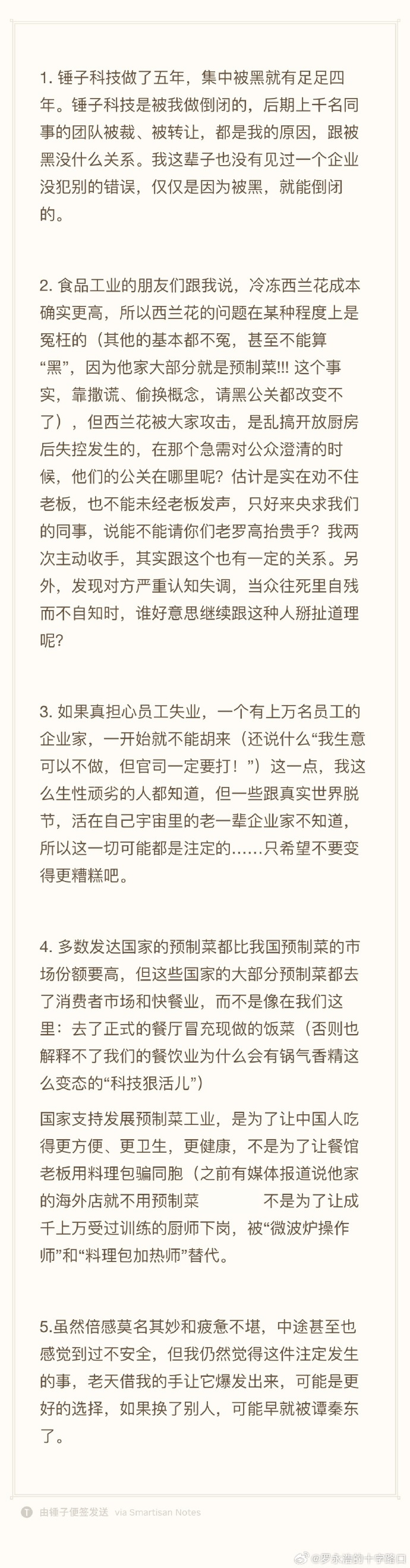 1月16日,@罗永浩的十字路口 再次发长文回应西贝贾国龙近日的言论。他表示,锤子科技做了五年,集中被黑就有足足四年。“锤子科技是被我做倒闭的,后期上千名同事的团队被裁、被转让,都是我的原因,跟被黑没什么关系。我这辈子也没有见过一个企业没犯别的错误,仅仅是因为被黑,就能倒闭的。”
