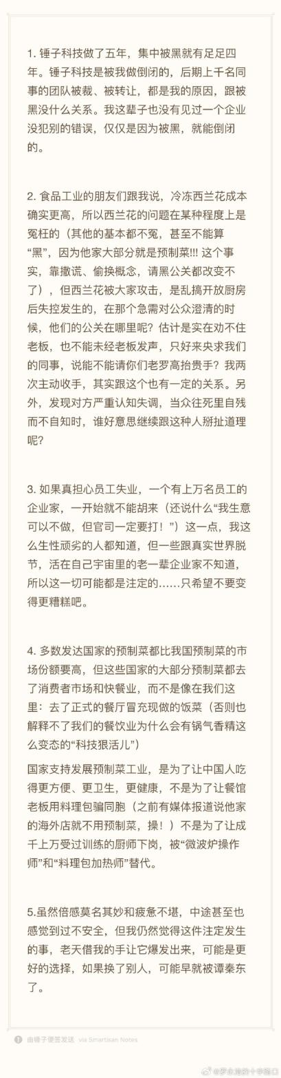 罗永浩在文中称:“食品工业的朋友们跟我说,冷冻西兰花成本确实更高,所以西兰花的问题在某种程度上是冤枉的(其他的基本都不冤,甚至不能算‘黑’,因为他家大部分就是预制菜!!这个事实,靠撒谎、偷换概念,请黑公关都改变不了),但西兰花被大家攻击,是乱搞开放厨房后失控发生的,在那个急需对公众澄清的时候,他们的公关在哪里呢?估计是实在劝不住老板,也不能未经老板发声,只好来央求我们的同事,说能不能请你们老罗高抬贵手?我两次主动收手,其实跟这个也有一定的关系。另外,发现对方严重认知失调,当众往死里自残而不自知时,谁好意思继续跟这种人掰扯道理呢?”