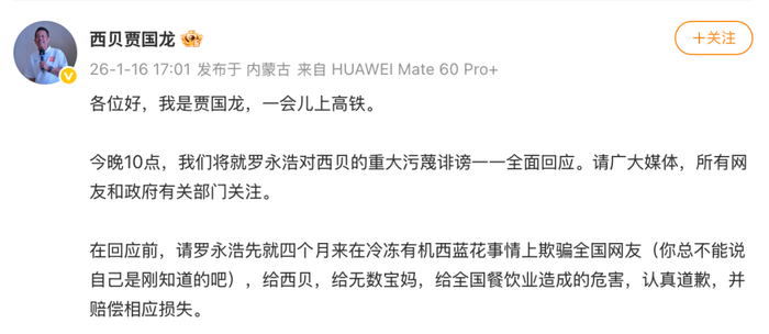 贾国龙最新发声:今晚10点,将就罗永浩对西贝的重大污蔑诽谤一一全面回应,要求认真道歉并赔偿损失
