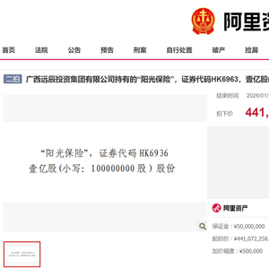 1月16日,据阿里资产平台,广西远辰投资集团有限公司(以下简称广西远辰投资集团)持有的阳光保险(HK06963)1亿股股权拍卖正式落幕,北京首源欣荣投资有限公司(以下简称北京首源欣荣投资)通过竞买号Q3847以最高应价胜出,成交价4.4107亿元。