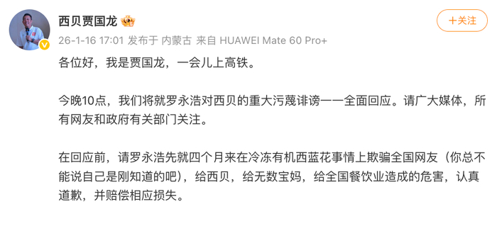 1月16日,西贝餐饮创始人贾国龙发文称,“今晚10点,我们将就罗永浩对西贝的重大污蔑诽谤一一全面回应。”