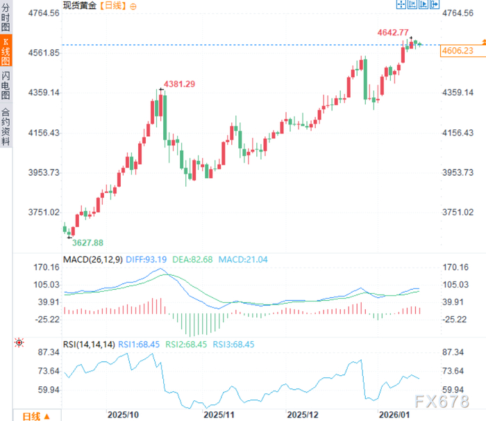周五欧市时段,现货黄金震荡下行,日内跌幅约0.27%,因近期强势上行带来小幅技术性回调,不改整体基本面支持下的看涨趋势,金价现位于本周三创下的历史高点4642.77美元不远处。