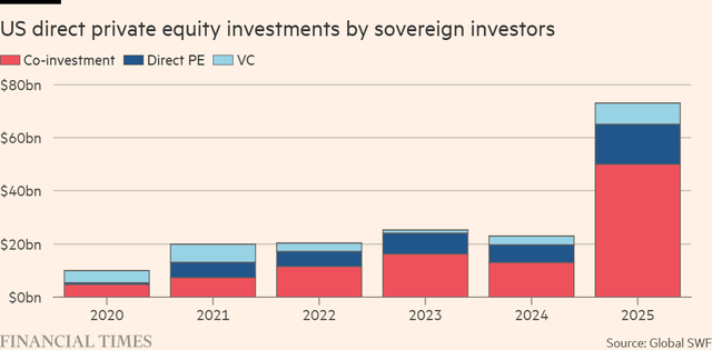 咨询公司Global SWF的数据显示,2025年全球主权财富基金的私人信贷投资达5500亿美元。去年,它们在美国的直接私募股权投资规模增长了两倍多,达到730亿美元,其中三分之二为联合投资。