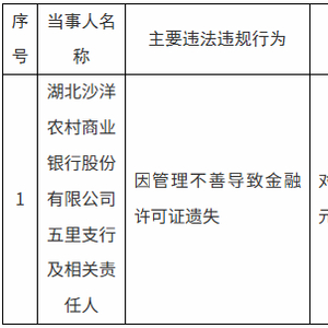 湖北沙洋农商行五里支行被罚:因管理不善导致金融许可证遗失 金融一线 01.1619:50 关注 1月16日金融一线消息,湖北沙洋农村商业银行股份有限公司五里支行及相关责任人因管理不善导致金融许可证遗失,被荆门金融监管分局对机构警告并罚款1万元,对汪超警告。