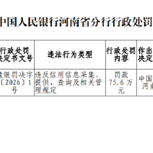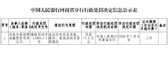 1月16日金融一线消息,中国人民银行河南省分行行政处罚决定信息公示表显示,河南中原消费金融股份有限公司因违反信用信息采集、 提供、查询及相关管理规定,被中国人民银行河南省分行罚款75.6 万元。