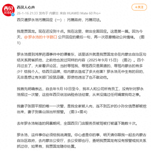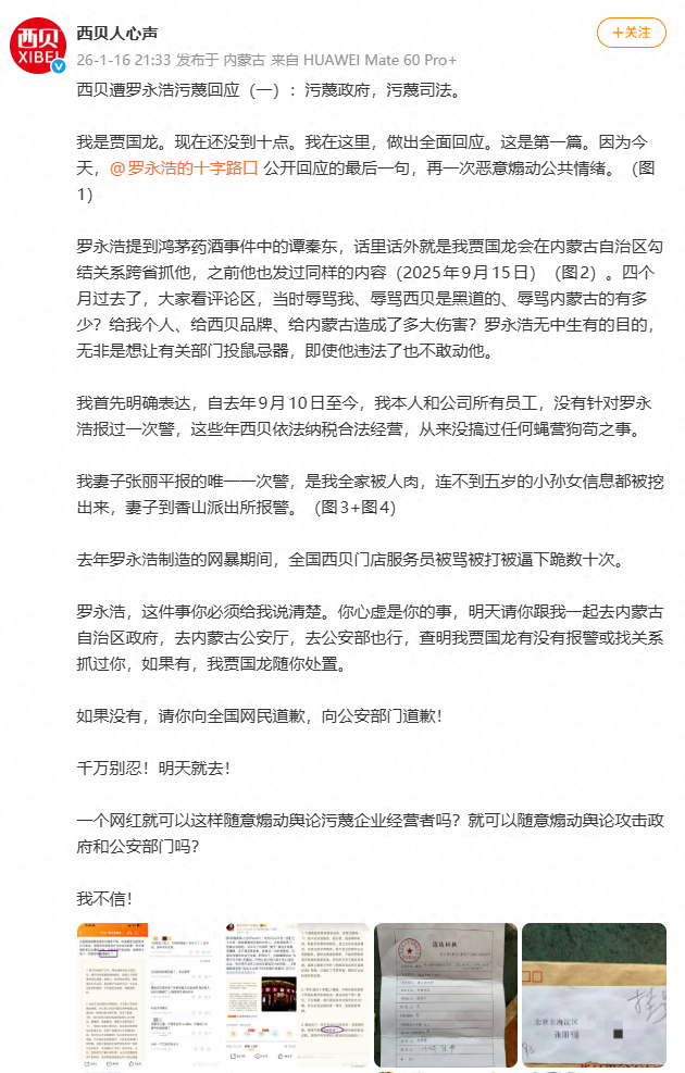 1月16日,认证为“内蒙古西贝餐饮集团有限公司”的@西贝人心声 发文,以贾国龙的身份回应“西贝遭罗永浩污蔑”。据媒体报道,罗永浩(@罗永浩的十字路口 )以及贾国龙(@西贝贾国龙 )双方微博账号,均已被禁言。