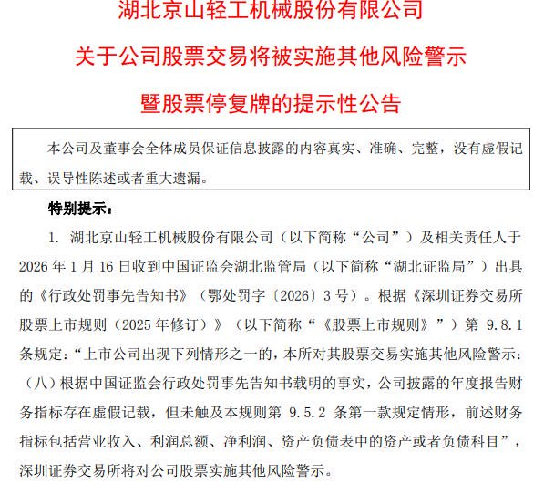 同日,京山轻机发布关于公司股票交易将被实施其他风险警示暨股票停复牌的提示性公告称,公司股票将自1月19日开市起停牌1天,自1月20日开市起复牌。公司股票将自1月20日开市起被实施其他风险警示,股票简称由“京山轻机”变更为“ST京机”;股票交易日涨跌幅限制为5%。