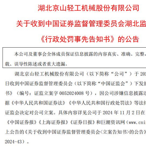 时间往前追溯,京山轻机2024年11月1日收到中国证券监督管理委员会(以下简称“中国证监会”)下发的《立案告知书》,因公司涉嫌信息披露违法违规,中国证监会决定对公司立案。