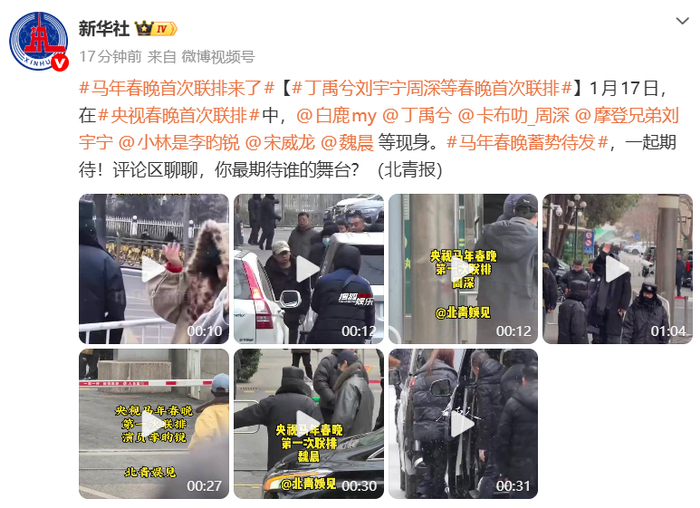 1月17日,中央广播电视总台央视2026年春晚第一次联排,众多明星包括白鹿、丁禹兮、周深、刘宇宁、李昀锐、宋威龙、魏晨等现身。
