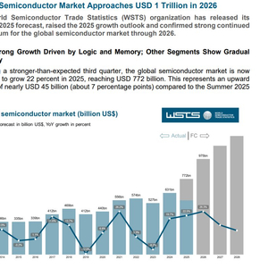 WSTS预计继2024年强劲反弹之后,2025年全球半导体市场将增长22.5%,总价值将达到7722亿美元,高于WSTS春季给出的展望;2026年半导体市场总价值则有望在2025年的强劲增长基础之上大举扩张至9755亿美元,接近SEMI预测的2030年1万亿美金的市场规模目标,意味着有望同比大增26%。