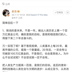 今日,俞浩在社交平台发文公开回应了近期关于“打造百万亿美元公司”的争议。俞浩表示,“我说的是未来,不是一年。做出人类历史上第一个百万亿美金公司,确实是我的目标。是我和相信我们的人,用接下来二十年去奋斗的。”