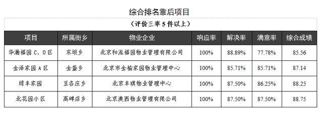 由北京市市民热线服务中心对朝阳区物业管理类诉求办理情况进行随机抽样回访,根据市民回访结果形成每家物业服务企业办理市民诉求成绩。