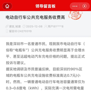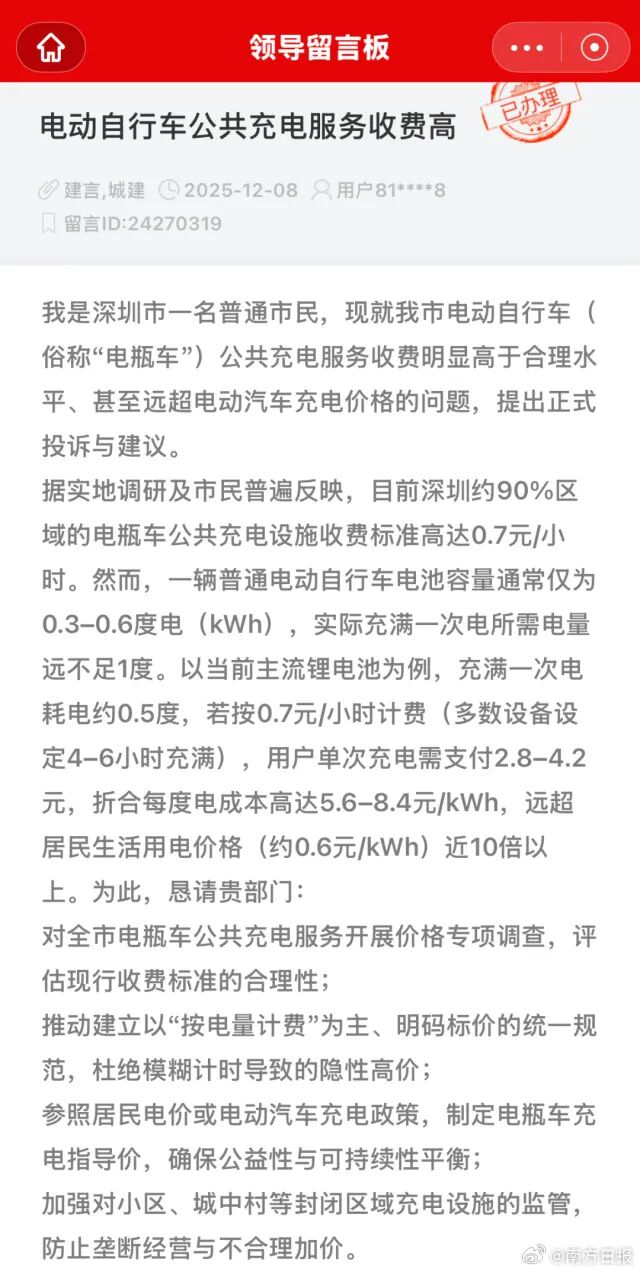 该市民在留言中表示,据实地调研及市民普遍反映,目前深圳约90%区域的电瓶车公共充电设施收费标准高达0.7元/小时。然而,一辆普通电动自行车电池容量通常仅为0.3-0.6度电(kWh),实际充满一次电所需电量远不足1度。以当前主流锂电池为例,充满一次电耗电约0.5度,若按0.7元/小时计费(多数设备设定4-6小时充满),用户单次充电需支付2.8-4.2元,折合每度电成本高达5.6-8.4元/kWh,远超居民生活用电价格(约0.6元/kWh)近10倍。