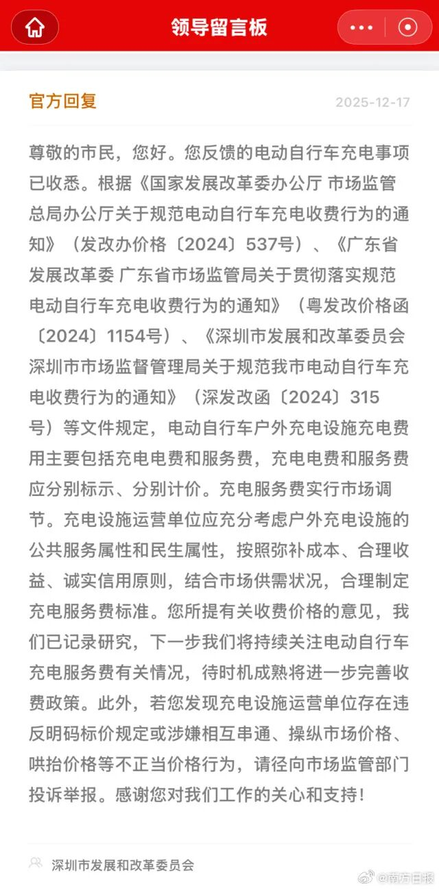 最近,有深圳市民通过人民网“领导留言板”反映,深圳市电动自行车公共充电服务收费明显高于合理水平,甚至远超电动汽车充电价格。对此,深圳市发展和改革委员作出回应,表示将持续关注相关情况并研究完善收费政策。