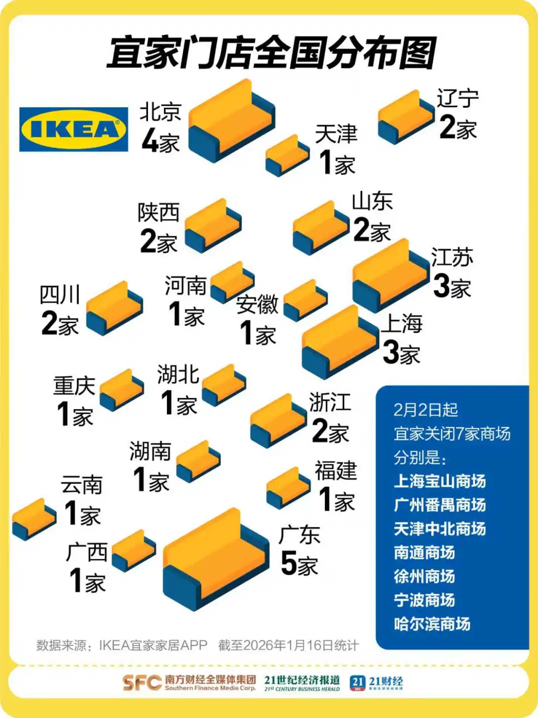 据IKEA宜家家居APP显示,即便关闭了部分门店,广东的宜家商场数量依然保持全国第一,北京(4家)、上海与江苏(各3家)紧随其后。