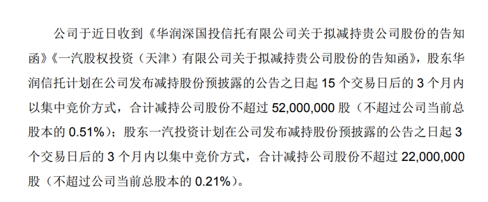 预披露的公告显示,华润信托计划在2025年12月31日至2026年3月30日期间,以集中竞价方式减持不超过5200万股,占总股本0.51%,原因是“资产配置调整需求”。