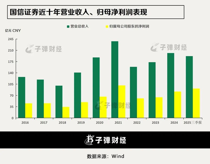 Wind数据显示,2020年至2024年,国信证券营业总收入187.84亿元、238.18亿元、158.76亿元、173.17亿元及201.67亿元,分别同比增长33.29%、26.80%、-33.35%、9.08%及16.46%。
