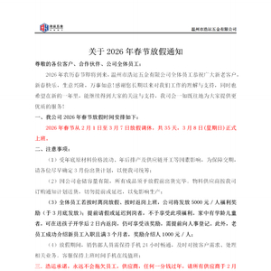 1月10日,浩运五金发布了2026年春节放假安排,2月1日至3月7日放假调休,共35天。全体员工若按时离岗放假、按时返岗,公司将发放每人5000元的福利奖励,奖金于3月底发放。另外,家里有学龄儿童的员工,可在孩子开学后两天内返岗,同样能享受这项奖励。
