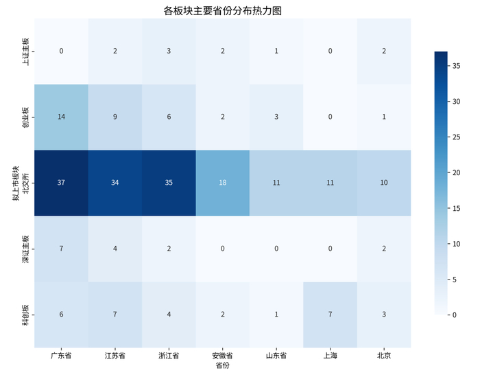 从热力图可见,北交所的专用设备(24家)和汽车制造(22家)名列前茅。