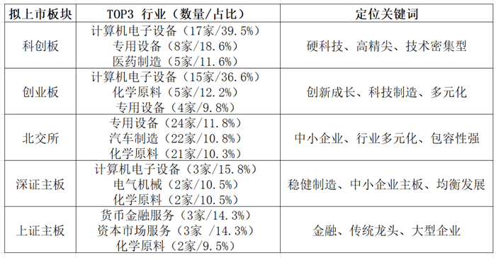 从目前排队的拟上市企业所处行业来看,整体特征为制造业占绝对主导。前10大行业中9个为制造业,其中,计算机电子、专用设备、化学原料、通用设备、汽车制造为五大核心赛道。