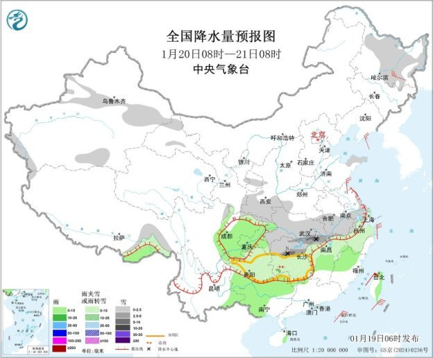 19日,河南、陕西、安徽、湖北、湖南等地有强降雪和冻雨天气,其中陕西南部、河南南部、安徽西部、湖北北部和西部等地部分地区有暴雪(10~18毫米),湖南西部、贵州东部等地部分地区冻雨量可达4~6毫米、局地8毫米以上。