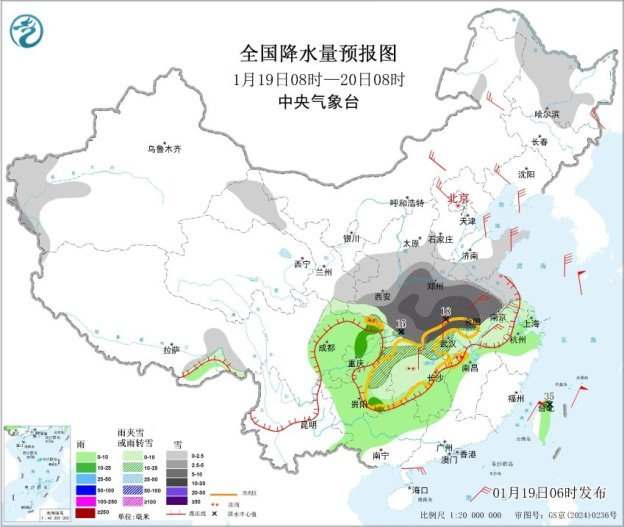 过去一天(1月18日),寒潮影响持续扩展,雨雪范围明显增大。最新气象监测资料显示,河北南部、山东、河南、苏皖北部、湖北北部及内蒙古东北部、黑龙江西部等地部分地区出现小到中雪或雨夹雪,河南等地出现冻雨;19日早晨,最低气温-10℃线位于华北中部至甘肃东部等地,气温0℃线南压至秦岭—淮河一带。
