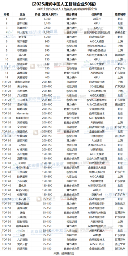 《2025胡润中国人工智能企业50强》
