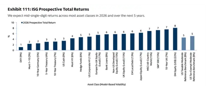注:各大资产类别2026年和未来五年的平均回报预期值,上图为2026年,下图为未来五年