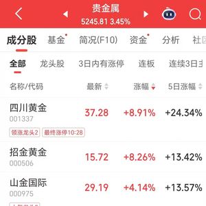 同日,国内贵金属板块上扬。截至发稿前,四川黄金、招金黄金涨超8%,山金国际、西部黄金、中金黄金等跟涨。