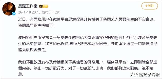 1月18日晚,演员吴磊工作室官方微博发布声明: