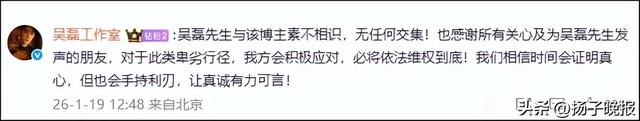 随后,吴磊工作室转发该微博:吴磊先生与该博主素不相识,无任何交集!也感谢所有关心及为吴磊先生发声的朋友,对于此类卑劣行径,我方会积极应对,必将依法维权到底!我们相信时间会证明真心,但也会手持利刃,让真诚有力可言!