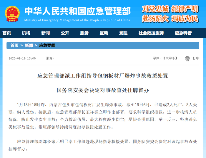财联社1月19日讯,据应急管理部官网,1月18日15时许,内蒙古包头市包钢板材厂发生爆炸事故,截至19日6时,已造成2人死亡、8人失联、84人受伤。接报后,应急管理部部长王祥喜立即作出部署,要求科学组织搜救,进一步核清人员情况,防止发生次生事故;全力救治伤员,最大程度减少伤亡;尽快查明原因,举一反三,坚决避免类似事故发生。带班部领导持续调度指导救援处置工作。